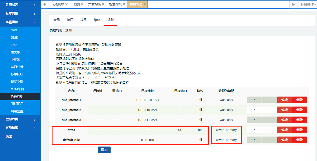 因为要使用WiFi优先,4G备份,所以设置名称为wwan_primary,同时必须关联成员wwan_m1_w1和3gwan1_m2_w1;分别如下: 4.4设置负载均衡控制规则