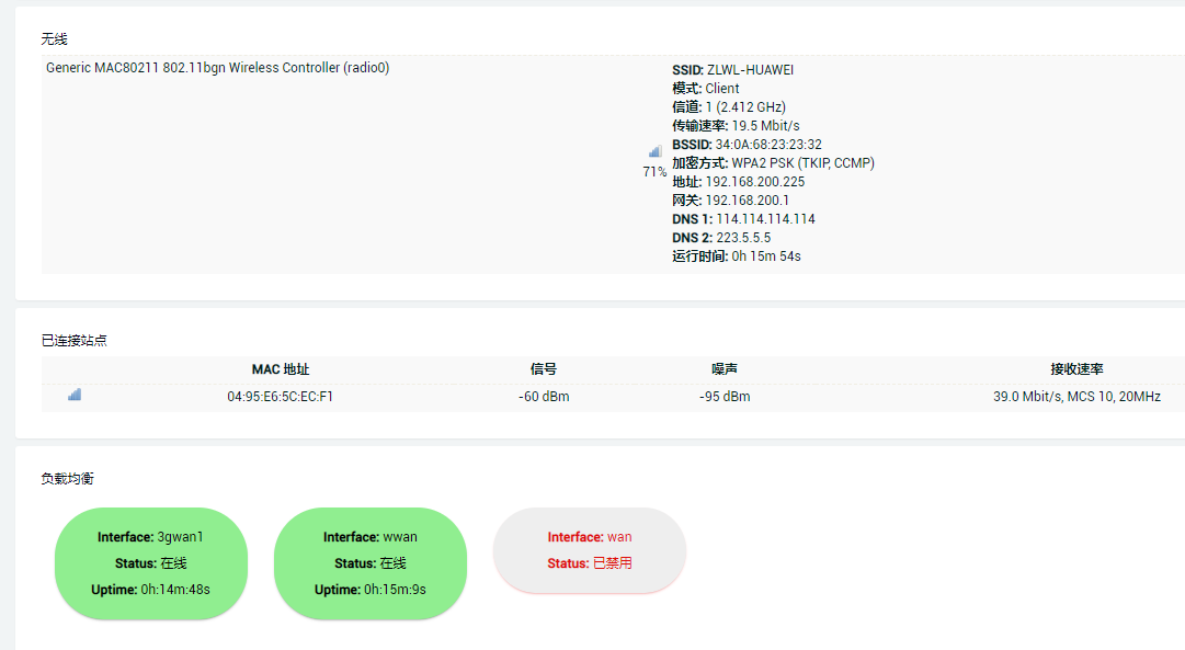 开启全局接口并保存应用设置,并查看4G卡和WiFi客户端负载均衡在线状态,分别如下: 5.无线wwan网络和4G网络使用测试